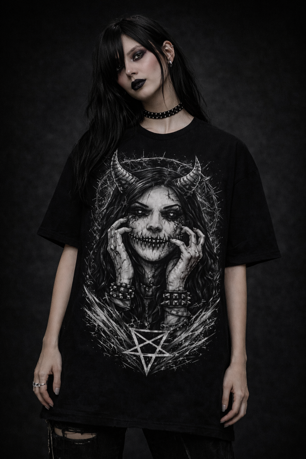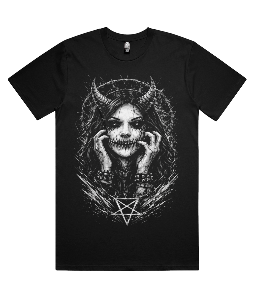 Each design is rendered in stark black and white, inspired by underground metal art, sacred iconography, and the shadows between devotion and defiance.